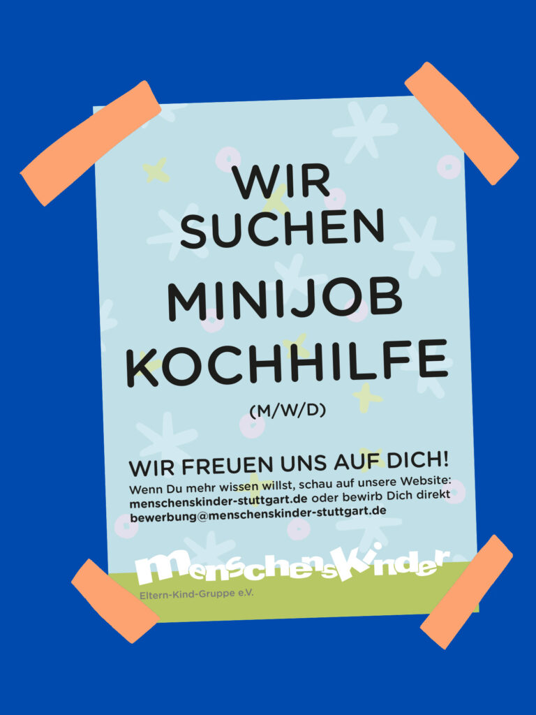 In unserer Kita in Stuttgart-West haben wir zurzeit offene Stellen für pädagogische Fachkräfte in Teilzeit und Vollzeit. Wenn Ihr Teil der MENSCHENSKINDER werden und mehr über die Arbeitsstellen erfahren wollt, klickt auf diesen Link. Hier in der Kategorie „Mitmachen: Offene Stellen“ veröffentlichen wir alle vakanten Positionen mit ausführlicher Stellenbeschreibung.